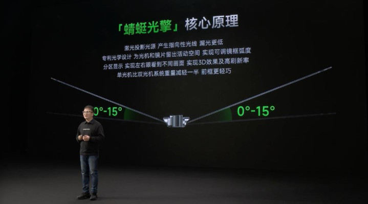 闪极科技与激光显示技术头部企业光峰科技合作,在其中引入了光峰独家“蜻蜓光擎”技术。该技术与Meta Display同源,可以实现单光机双目分区显示,形成3D的显示效果,还可以降低全屏显示的功耗。