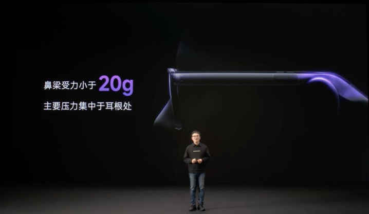 其采用钛合金柔性材料,镜腿只有0.7mm并且可弯折贴合头型,整机重量仅有29克,鼻梁压力体感重量小于15克,耳根压力在20克左右。