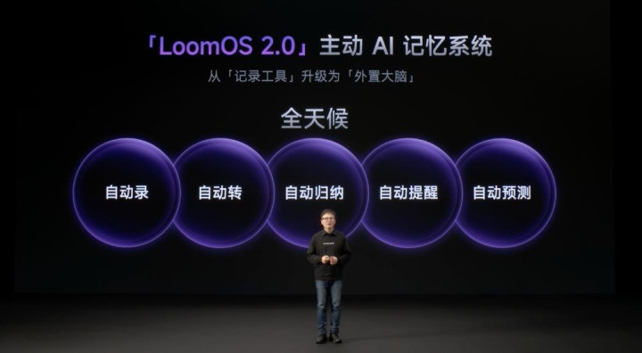 其搭载「LoomOS 2.0」主动AI记忆系统,可以主动实时采集音频视频信息,并进行转存和总结等。